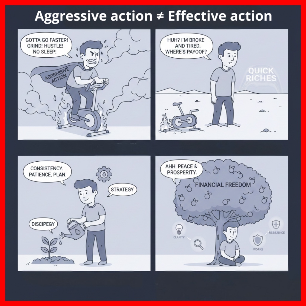 Aggression is a temporary illusion of victory that mortgages your future. Effectiveness is quiet, persistent discipline—the kind that compounds wealth, focus, and peace over decades.
